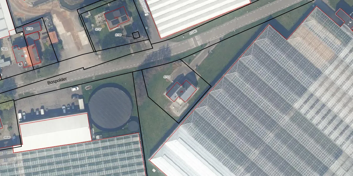 Bospolder 29 is gelegen op kadastraal perceel NWK01D9733. Deze kadastrale aanduiding is uniek en wordt gebruikt door het Kadaster om eigendomsrechten en andere zakelijke rechten vast te leggen. Het perceel maakt onderdeel uit van de kadastrale gemeente Naaldwijk.