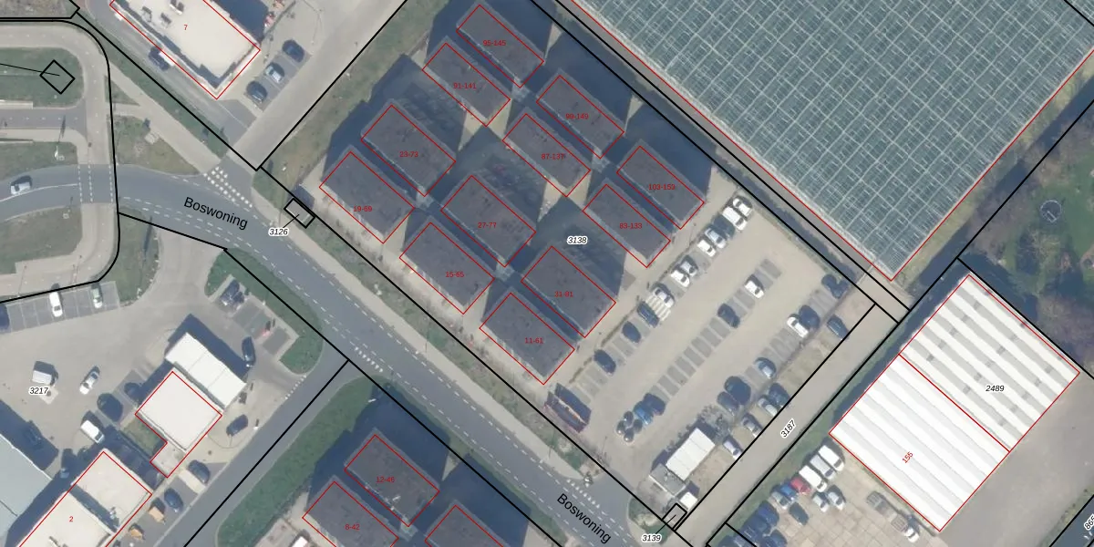 Boswoning 55 is gelegen op kadastraal perceel NWK01H3138. Deze kadastrale aanduiding is uniek en wordt gebruikt door het Kadaster om eigendomsrechten en andere zakelijke rechten vast te leggen. Het perceel maakt onderdeel uit van de kadastrale gemeente Naaldwijk.