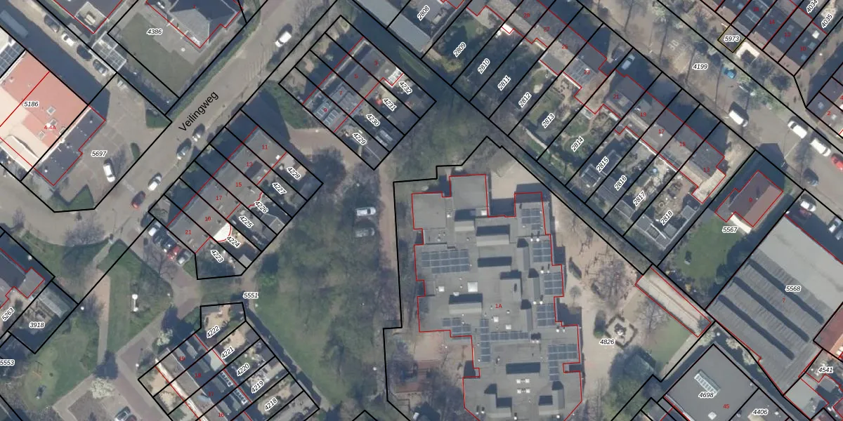 Het perceel waarop Veilingweg 1-A staat heeft een oppervlakte van 4053 m². Dit is een zeer groot perceel. De perceeloppervlakte wordt geregistreerd door het Kadaster. Gedetailleerde informatie over de maten van dit perceel kunt u vinden in het rapport Kadastrale kaart met maatvoering van Veilingweg 1-A.