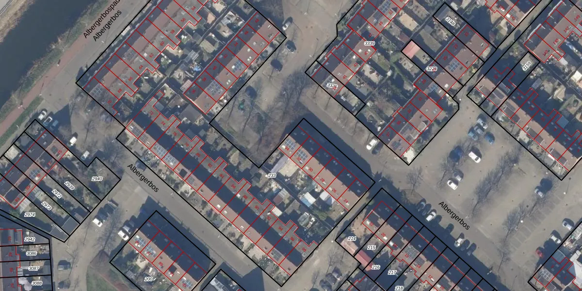 Het perceel waarop Albergerbos 34 staat heeft een oppervlakte van 4865 m². Dit is een zeer groot perceel. De perceeloppervlakte wordt geregistreerd door het Kadaster. Gedetailleerde informatie over de maten van dit perceel kunt u vinden in het rapport Kadastrale kaart met maatvoering van Albergerbos 34.