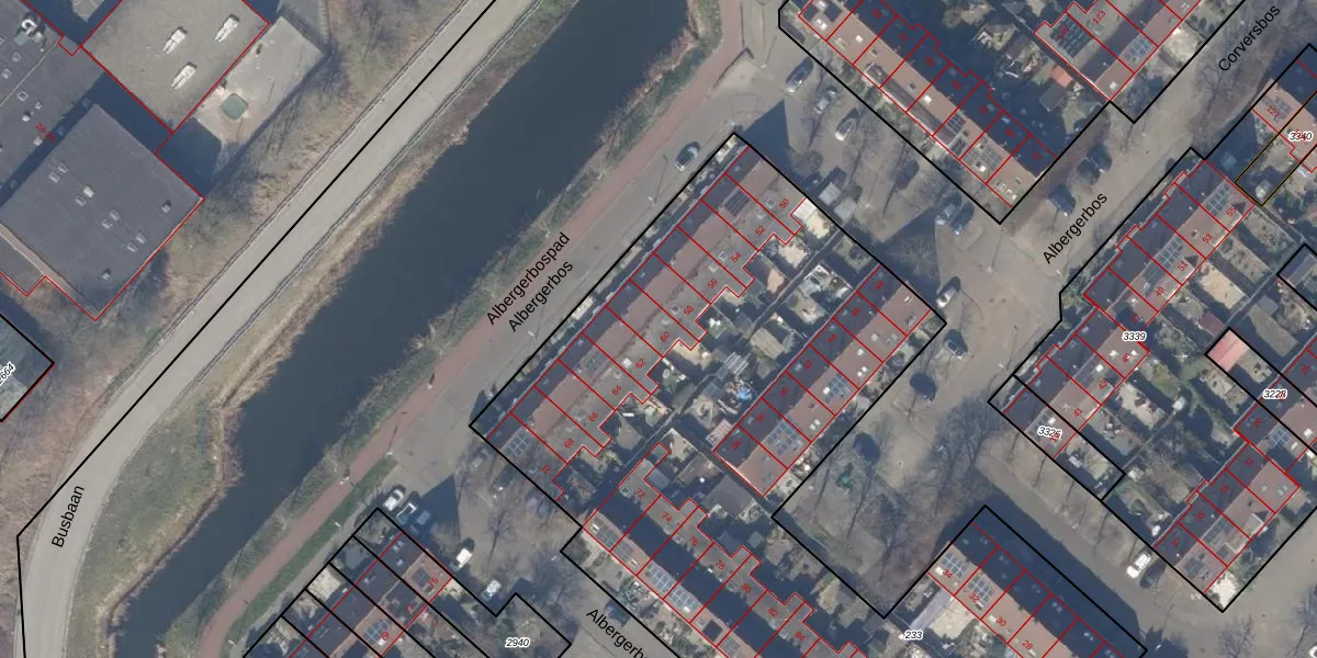 Het perceel waarop Albergerbos 60 staat heeft een oppervlakte van 4865 m². Dit is een zeer groot perceel. De perceeloppervlakte wordt geregistreerd door het Kadaster. Gedetailleerde informatie over de maten van dit perceel kunt u vinden in het rapport Kadastrale kaart met maatvoering van Albergerbos 60.