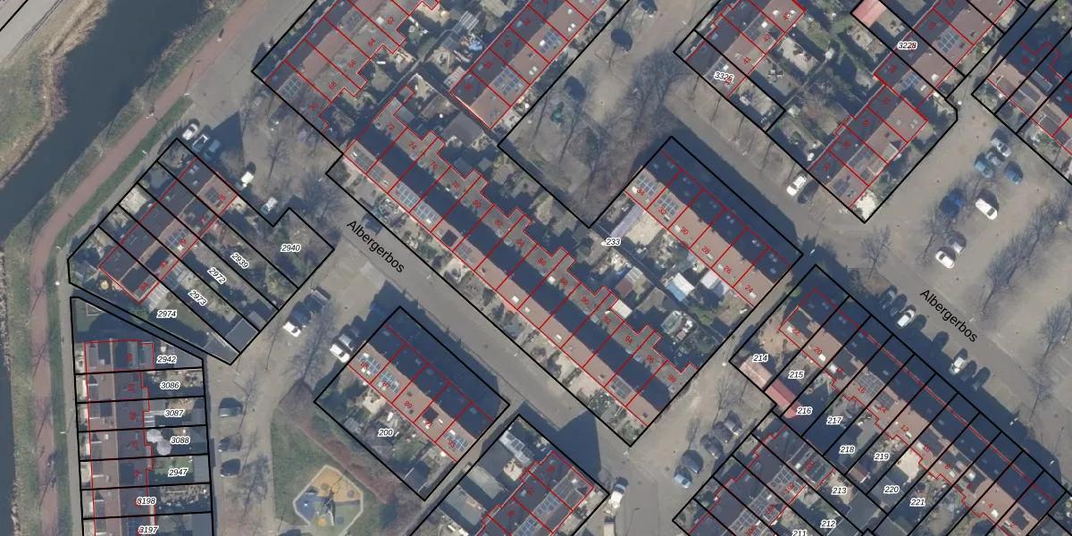 Het perceel waarop Albergerbos 86 staat heeft een oppervlakte van 4865 m². Dit is een zeer groot perceel. De perceeloppervlakte wordt geregistreerd door het Kadaster. Gedetailleerde informatie over de maten van dit perceel kunt u vinden in het rapport Kadastrale kaart met maatvoering van Albergerbos 86.