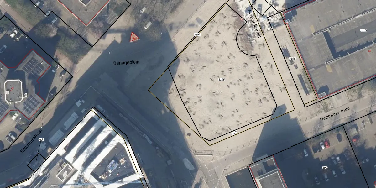 Het perceel waarop Berlageplein 67 staat heeft een oppervlakte van 2372 m². Dit is een zeer groot perceel. De perceeloppervlakte wordt geregistreerd door het Kadaster. Gedetailleerde informatie over de maten van dit perceel kunt u vinden in het rapport Kadastrale kaart met maatvoering van Berlageplein 67.