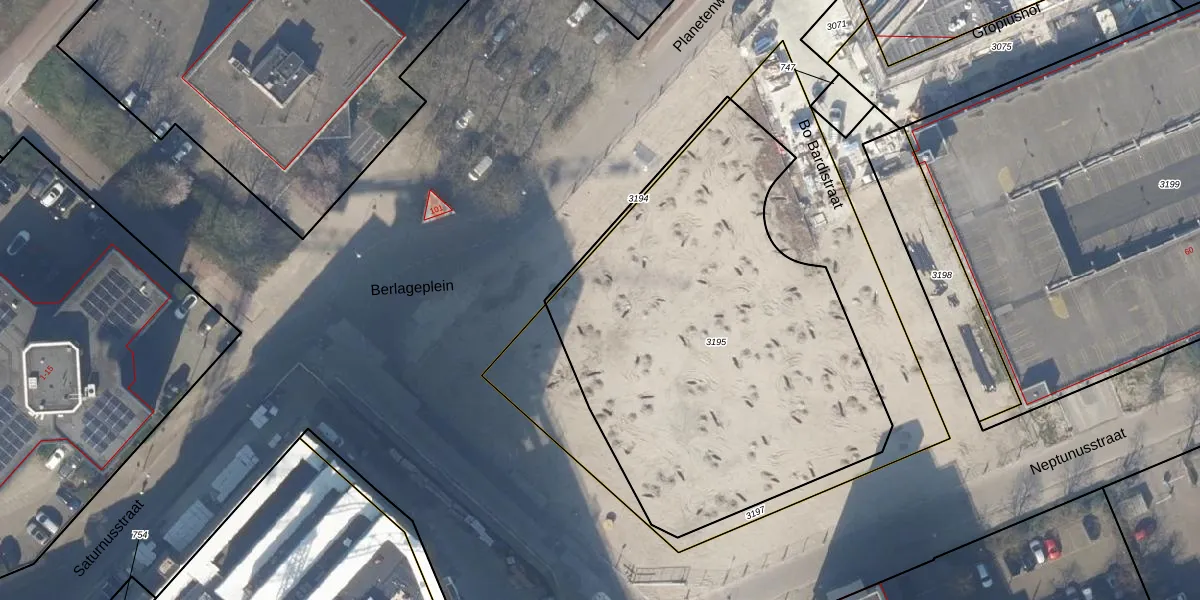 Het perceel waarop Berlageplein 9 staat heeft een oppervlakte van 2372 m². Dit is een zeer groot perceel. De perceeloppervlakte wordt geregistreerd door het Kadaster. Gedetailleerde informatie over de maten van dit perceel kunt u vinden in het rapport Kadastrale kaart met maatvoering van Berlageplein 9.