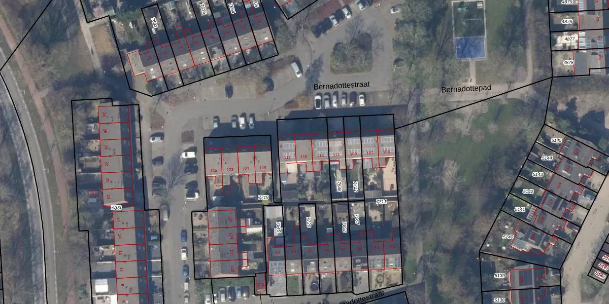 Het perceel waarop Bernadottestraat 115 staat heeft een oppervlakte van 1800 m². Dit is een zeer groot perceel. De perceeloppervlakte wordt geregistreerd door het Kadaster. Gedetailleerde informatie over de maten van dit perceel kunt u vinden in het rapport Kadastrale kaart met maatvoering van Bernadottestraat 115.