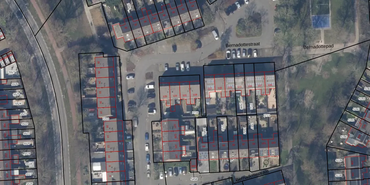 Bernadottestraat 121 is gelegen op kadastraal perceel HLM03D7719. Deze kadastrale aanduiding is uniek en wordt gebruikt door het Kadaster om eigendomsrechten en andere zakelijke rechten vast te leggen. Het perceel maakt onderdeel uit van de kadastrale gemeente Haarlemmermeer.