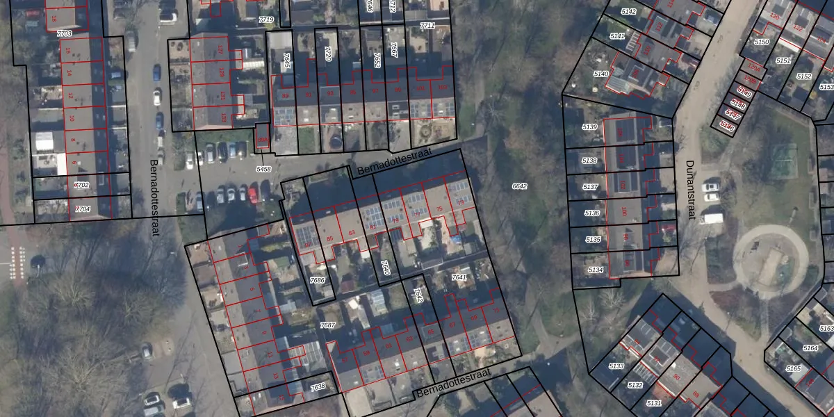 Het perceel waarop Bernadottestraat 77 staat heeft een oppervlakte van 1003 m². Dit is een zeer groot perceel. De perceeloppervlakte wordt geregistreerd door het Kadaster. Gedetailleerde informatie over de maten van dit perceel kunt u vinden in het rapport Kadastrale kaart met maatvoering van Bernadottestraat 77.