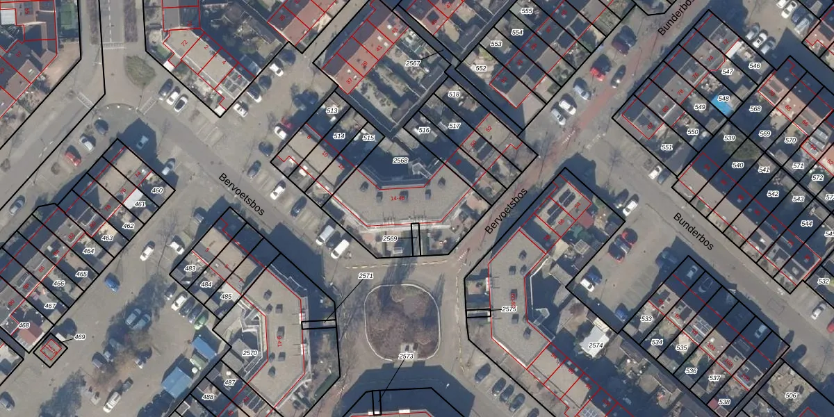 Het perceel waarop Bervoetsbos 30 staat heeft een oppervlakte van 1343 m². Dit is een zeer groot perceel. De perceeloppervlakte wordt geregistreerd door het Kadaster. Gedetailleerde informatie over de maten van dit perceel kunt u vinden in het rapport Kadastrale kaart met maatvoering van Bervoetsbos 30.
