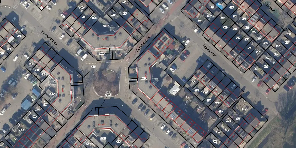 Het perceel waarop Bervoetsbos 64 staat heeft een oppervlakte van 2179 m². Dit is een zeer groot perceel. De perceeloppervlakte wordt geregistreerd door het Kadaster. Gedetailleerde informatie over de maten van dit perceel kunt u vinden in het rapport Kadastrale kaart met maatvoering van Bervoetsbos 64.