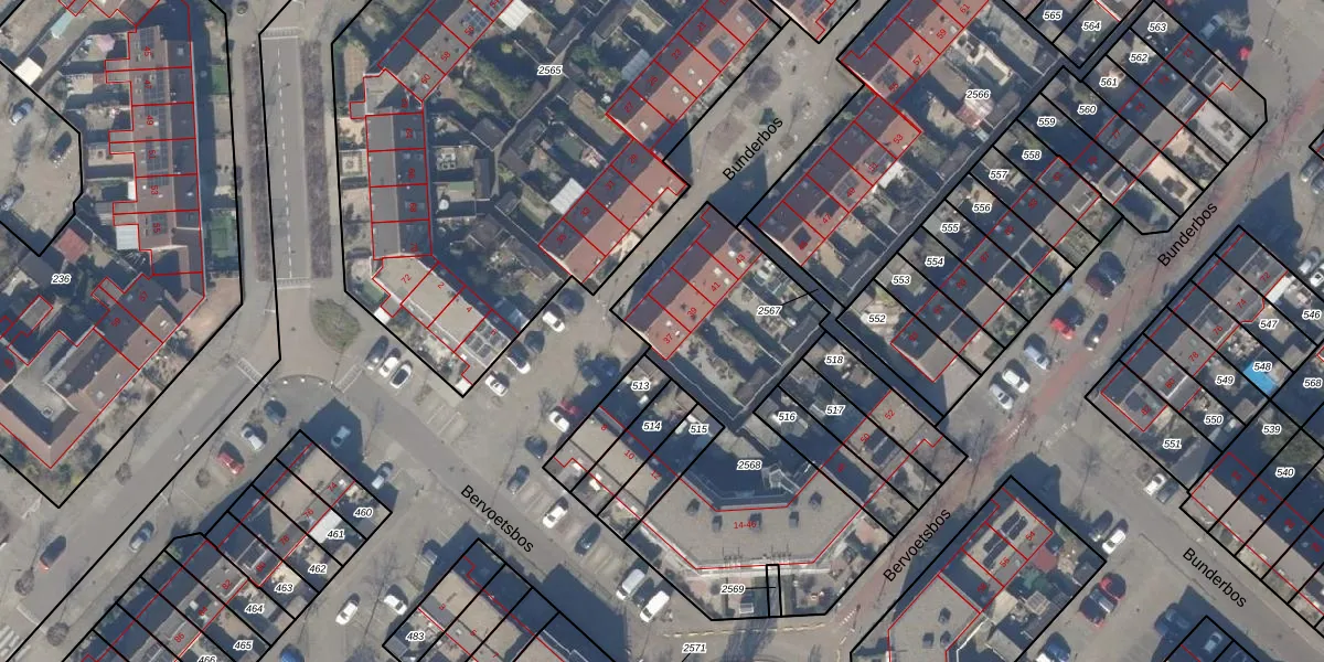 Het perceel waarop Bunderbos 37 staat heeft een oppervlakte van 1343 m². Dit is een zeer groot perceel. De perceeloppervlakte wordt geregistreerd door het Kadaster. Gedetailleerde informatie over de maten van dit perceel kunt u vinden in het rapport Kadastrale kaart met maatvoering van Bunderbos 37.