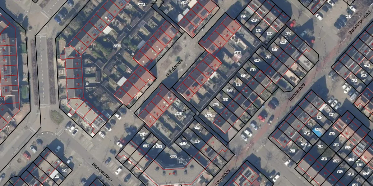 Bunderbos 45 is gelegen op kadastraal perceel HLM03P2566. Deze kadastrale aanduiding is uniek en wordt gebruikt door het Kadaster om eigendomsrechten en andere zakelijke rechten vast te leggen. Het perceel maakt onderdeel uit van de kadastrale gemeente Haarlemmermeer.