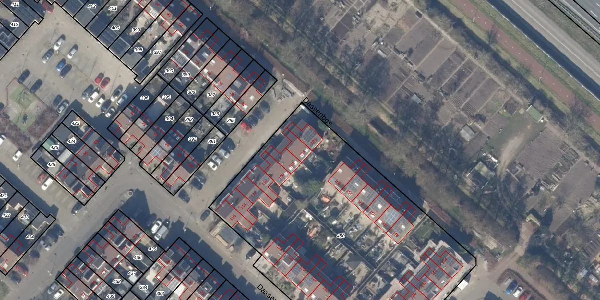 Het perceel waarop Dassenbos 104 staat heeft een oppervlakte van 3840 m². Dit is een zeer groot perceel. De perceeloppervlakte wordt geregistreerd door het Kadaster. Gedetailleerde informatie over de maten van dit perceel kunt u vinden in het rapport Kadastrale kaart met maatvoering van Dassenbos 104.