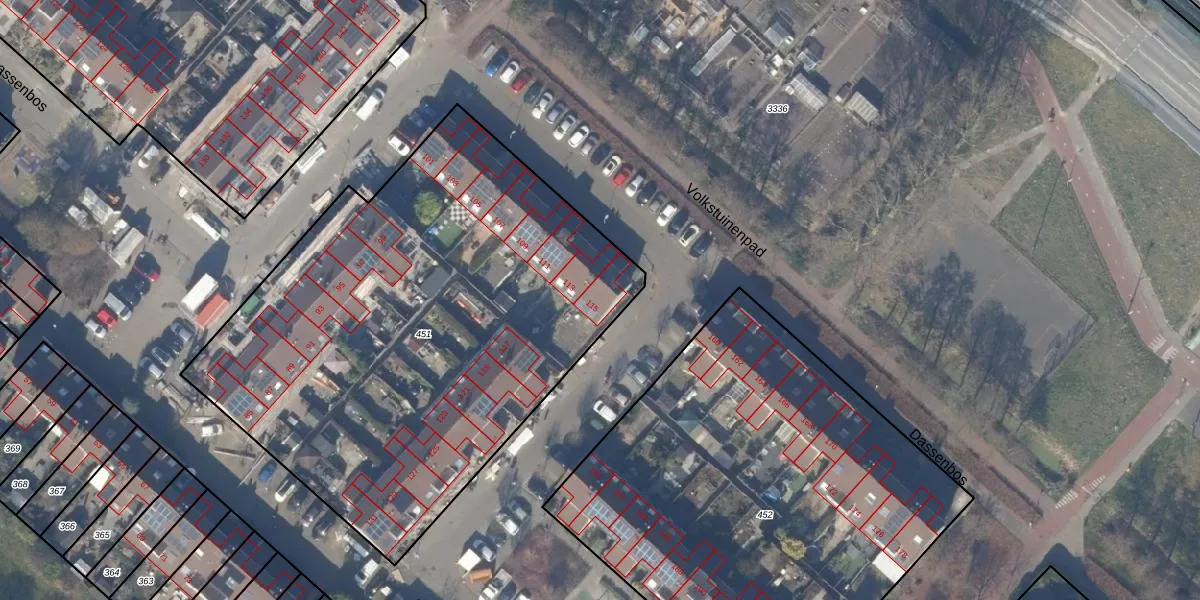 Dassenbos 115 is gelegen op kadastraal perceel HLM03P451. Deze kadastrale aanduiding is uniek en wordt gebruikt door het Kadaster om eigendomsrechten en andere zakelijke rechten vast te leggen. Het perceel maakt onderdeel uit van de kadastrale gemeente Haarlemmermeer.
