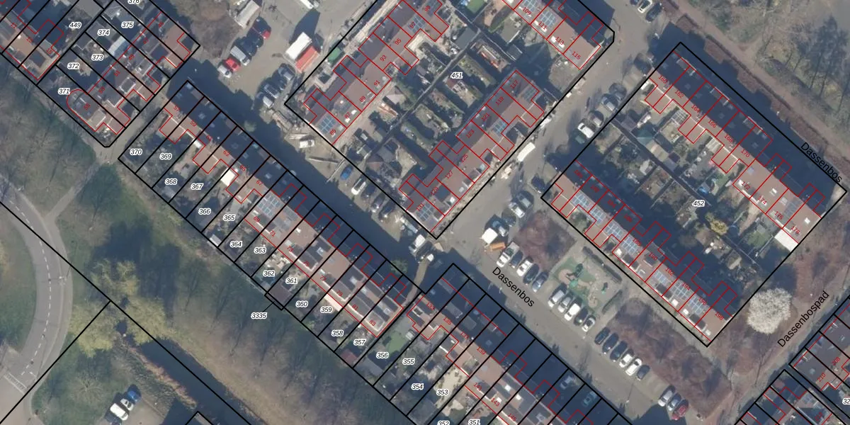 Het perceel waarop Dassenbos 131 staat heeft een oppervlakte van 2970 m². Dit is een zeer groot perceel. De perceeloppervlakte wordt geregistreerd door het Kadaster. Gedetailleerde informatie over de maten van dit perceel kunt u vinden in het rapport Kadastrale kaart met maatvoering van Dassenbos 131.