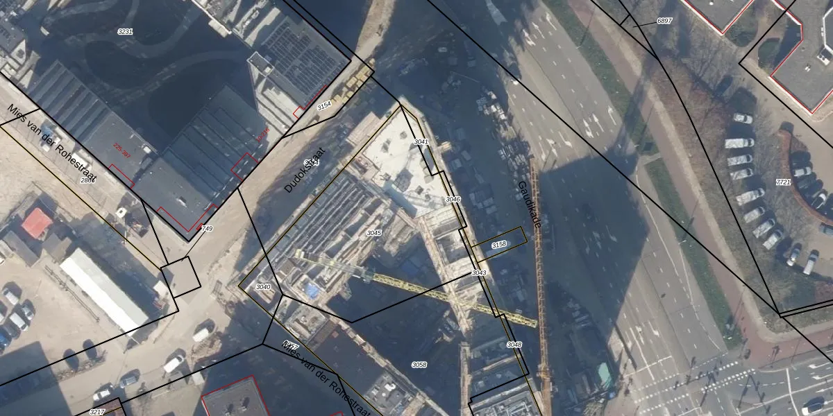 Het perceel waarop Gaudikade 179 staat heeft een oppervlakte van 1426 m². Dit is een zeer groot perceel. De perceeloppervlakte wordt geregistreerd door het Kadaster. Gedetailleerde informatie over de maten van dit perceel kunt u vinden in het rapport Kadastrale kaart met maatvoering van Gaudikade 179.