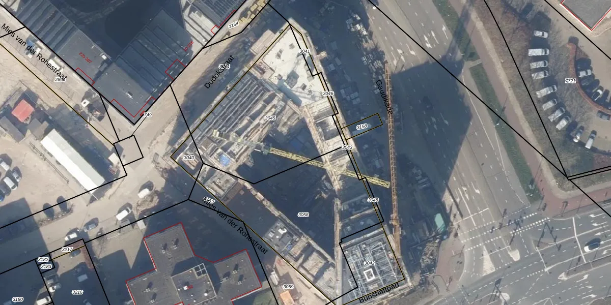 Het perceel waarop Gaudikade 291 staat heeft een oppervlakte van 1426 m². Dit is een zeer groot perceel. De perceeloppervlakte wordt geregistreerd door het Kadaster. Gedetailleerde informatie over de maten van dit perceel kunt u vinden in het rapport Kadastrale kaart met maatvoering van Gaudikade 291.