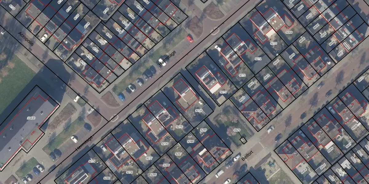 Het perceel waarop Hermitage 9 staat heeft een oppervlakte van 394 m². Dit is een groot perceel. De perceeloppervlakte wordt geregistreerd door het Kadaster. Gedetailleerde informatie over de maten van dit perceel kunt u vinden in het rapport Kadastrale kaart met maatvoering van Hermitage 9.