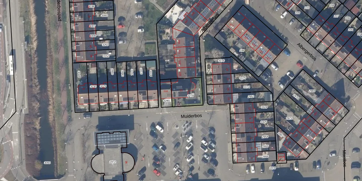 Muiderbos 21 is gelegen op kadastraal perceel HLM03P3279. Deze kadastrale aanduiding is uniek en wordt gebruikt door het Kadaster om eigendomsrechten en andere zakelijke rechten vast te leggen. Het perceel maakt onderdeel uit van de kadastrale gemeente Haarlemmermeer.