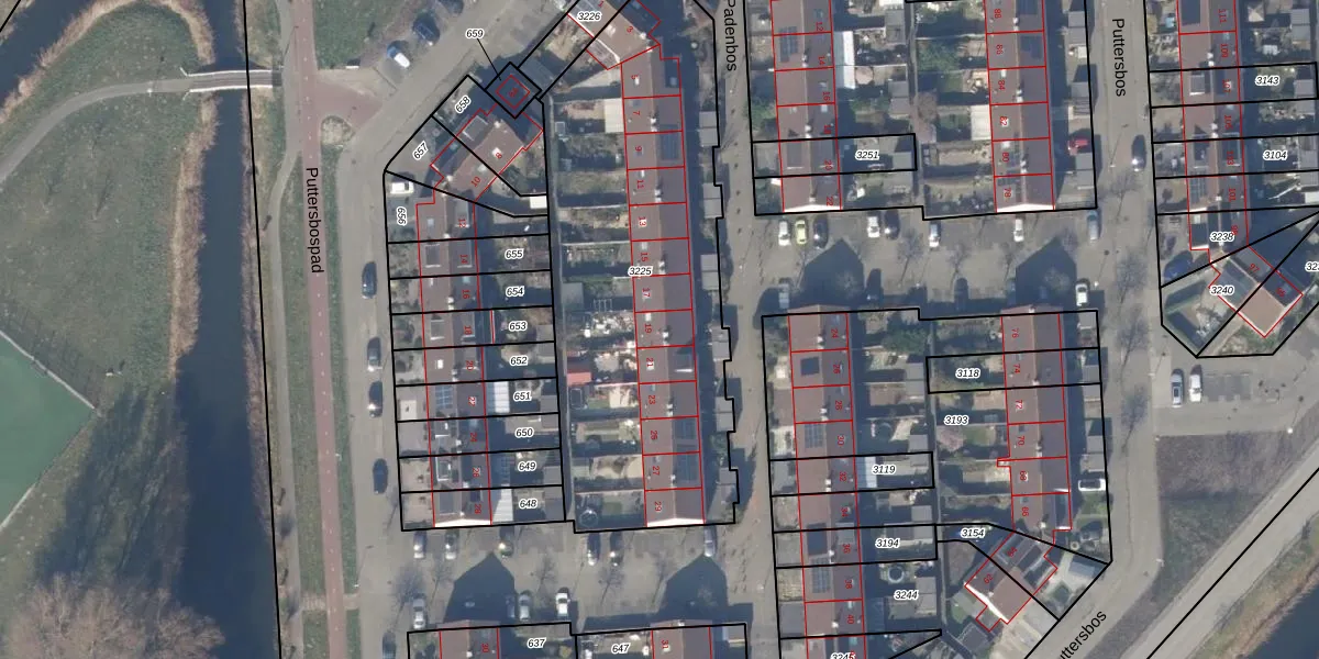 Het perceel waarop Padenbos 19 staat heeft een oppervlakte van 2000 m². Dit is een zeer groot perceel. De perceeloppervlakte wordt geregistreerd door het Kadaster. Gedetailleerde informatie over de maten van dit perceel kunt u vinden in het rapport Kadastrale kaart met maatvoering van Padenbos 19.