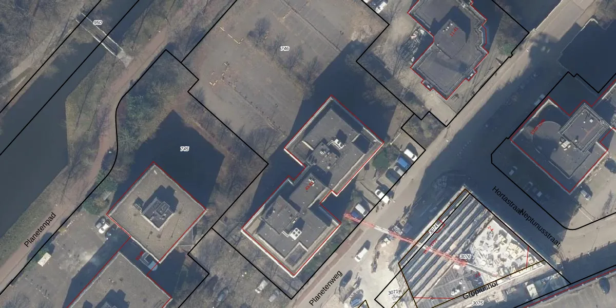 Het perceel waarop Planetenweg 57 staat heeft een oppervlakte van 4966 m². Dit is een zeer groot perceel. De perceeloppervlakte wordt geregistreerd door het Kadaster. Gedetailleerde informatie over de maten van dit perceel kunt u vinden in het rapport Kadastrale kaart met maatvoering van Planetenweg 57.