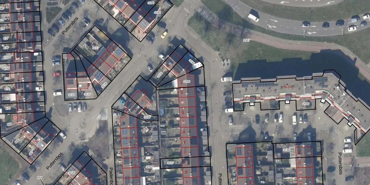 Het perceel waarop Puttersbos 104 staat heeft een oppervlakte van 3421 m². Dit is een zeer groot perceel. De perceeloppervlakte wordt geregistreerd door het Kadaster. Gedetailleerde informatie over de maten van dit perceel kunt u vinden in het rapport Kadastrale kaart met maatvoering van Puttersbos 104.