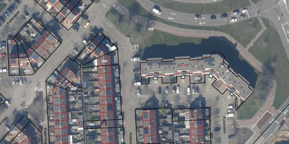 Puttersbos 221 is gelegen op kadastraal perceel HLM03P2556. Deze kadastrale aanduiding is uniek en wordt gebruikt door het Kadaster om eigendomsrechten en andere zakelijke rechten vast te leggen. Het perceel maakt onderdeel uit van de kadastrale gemeente Haarlemmermeer.