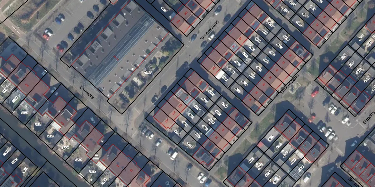 Het perceel waarop Simonszand 108 staat heeft een oppervlakte van 121 m². Dit is een middelgroot perceel. De perceeloppervlakte wordt geregistreerd door het Kadaster. Gedetailleerde informatie over de maten van dit perceel kunt u vinden in het rapport Kadastrale kaart met maatvoering van Simonszand 108.