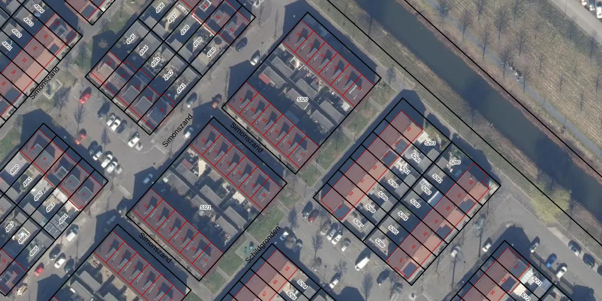 Het perceel waarop Simonszand 37 staat heeft een oppervlakte van 1412 m². Dit is een zeer groot perceel. De perceeloppervlakte wordt geregistreerd door het Kadaster. Gedetailleerde informatie over de maten van dit perceel kunt u vinden in het rapport Kadastrale kaart met maatvoering van Simonszand 37.