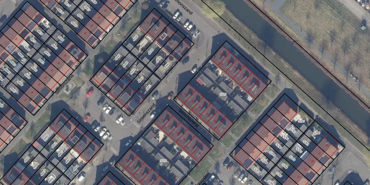 Het perceel waarop Simonszand 47 staat heeft een oppervlakte van 1412 m². Dit is een zeer groot perceel. De perceeloppervlakte wordt geregistreerd door het Kadaster. Gedetailleerde informatie over de maten van dit perceel kunt u vinden in het rapport Kadastrale kaart met maatvoering van Simonszand 47.