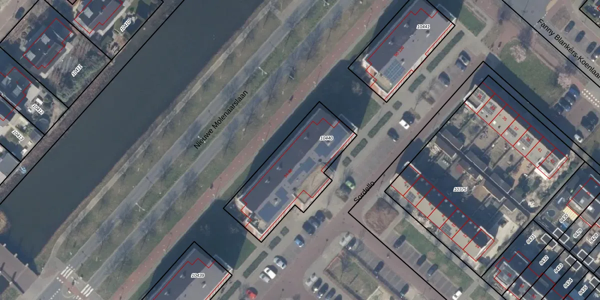 Het perceel waarop Sordello 34 staat heeft een oppervlakte van 865 m². Dit is een groot perceel. De perceeloppervlakte wordt geregistreerd door het Kadaster. Gedetailleerde informatie over de maten van dit perceel kunt u vinden in het rapport Kadastrale kaart met maatvoering van Sordello 34.