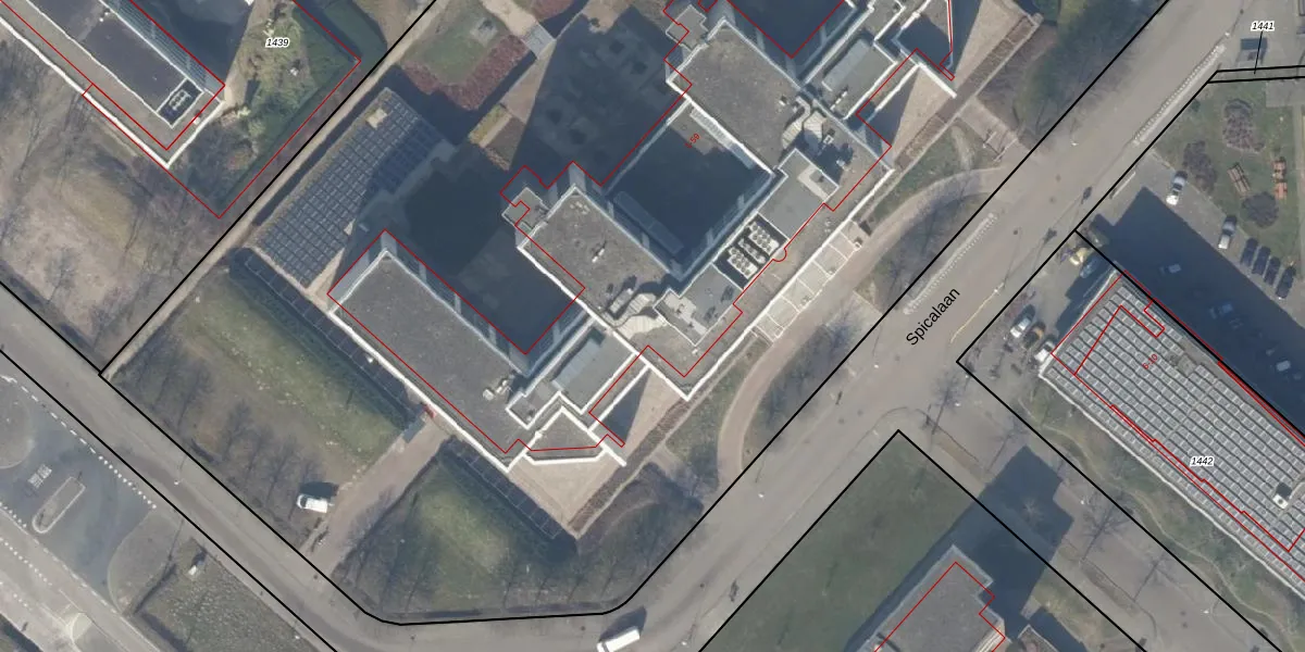 Het perceel waarop Spicalaan 21 staat heeft een oppervlakte van 1,3 ha. Dit is een zeer groot perceel. De perceeloppervlakte wordt geregistreerd door het Kadaster. Gedetailleerde informatie over de maten van dit perceel kunt u vinden in het rapport Kadastrale kaart met maatvoering van Spicalaan 21.
