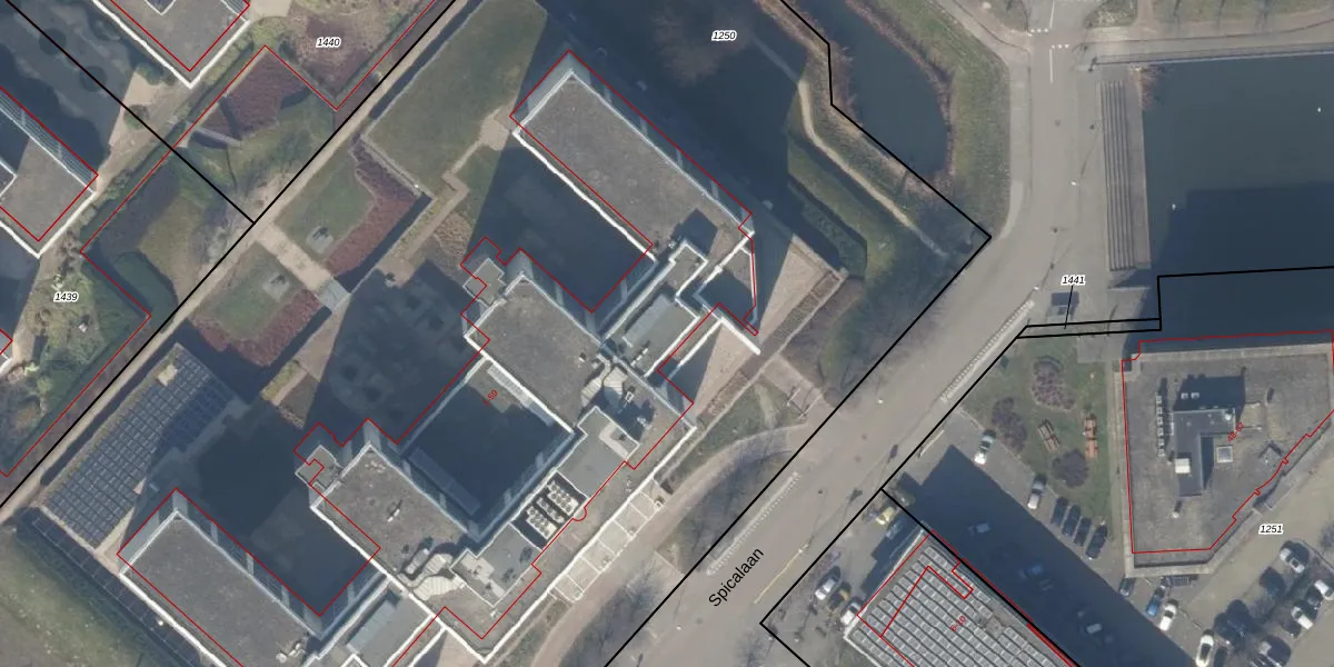 Het perceel waarop Spicalaan 49 staat heeft een oppervlakte van 1,3 ha. Dit is een zeer groot perceel. De perceeloppervlakte wordt geregistreerd door het Kadaster. Gedetailleerde informatie over de maten van dit perceel kunt u vinden in het rapport Kadastrale kaart met maatvoering van Spicalaan 49.