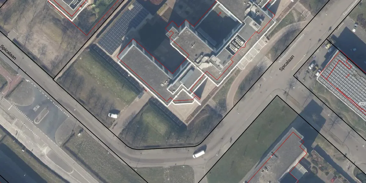 Het perceel waarop Spicalaan 9 staat heeft een oppervlakte van 1,3 ha. Dit is een zeer groot perceel. De perceeloppervlakte wordt geregistreerd door het Kadaster. Gedetailleerde informatie over de maten van dit perceel kunt u vinden in het rapport Kadastrale kaart met maatvoering van Spicalaan 9.