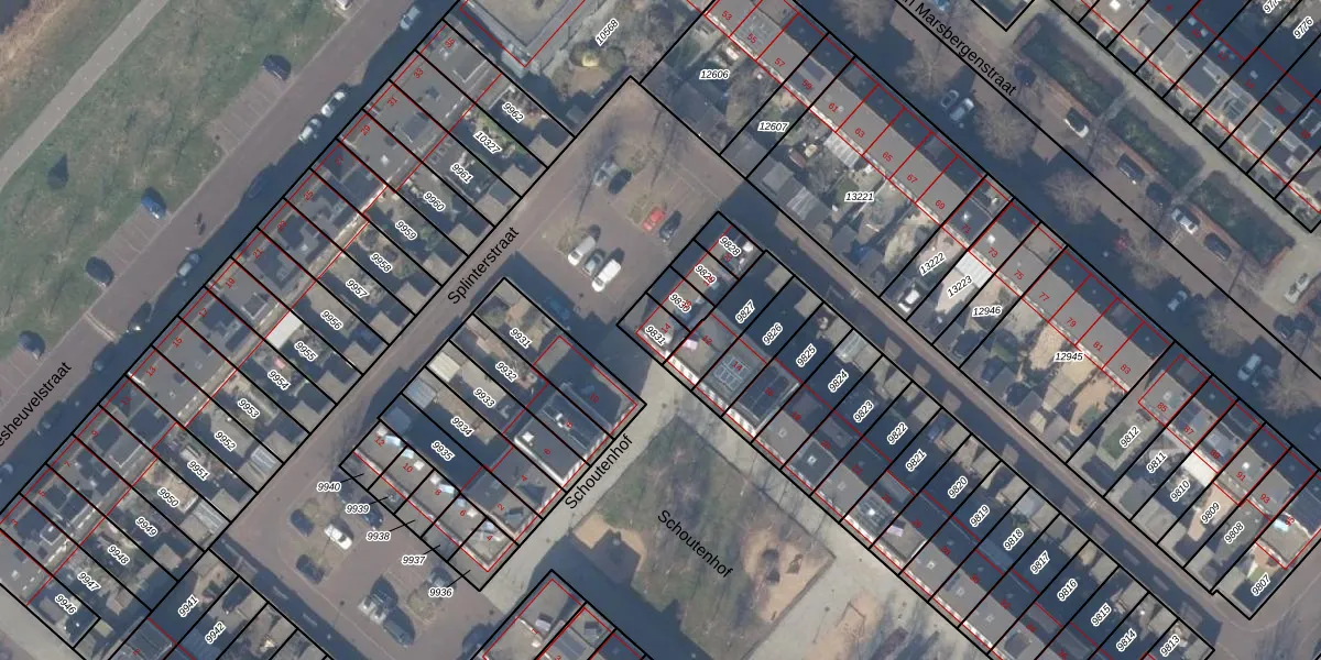 Het perceel waarop Splinterstraat 14 staat heeft een oppervlakte van 60 m². Dit is een klein perceel. De perceeloppervlakte wordt geregistreerd door het Kadaster. Gedetailleerde informatie over de maten van dit perceel kunt u vinden in het rapport Kadastrale kaart met maatvoering van Splinterstraat 14.