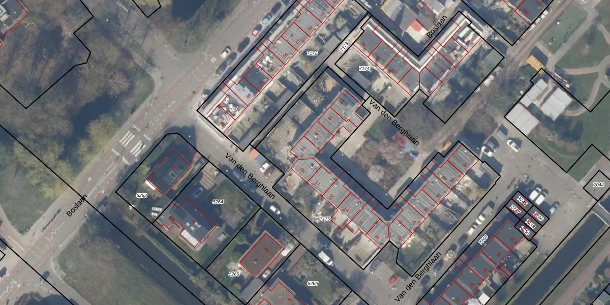 Het perceel waarop Van den Berghlaan 61 staat heeft een oppervlakte van 2216 m². Dit is een zeer groot perceel. De perceeloppervlakte wordt geregistreerd door het Kadaster. Gedetailleerde informatie over de maten van dit perceel kunt u vinden in het rapport Kadastrale kaart met maatvoering van Van den Berghlaan 61.