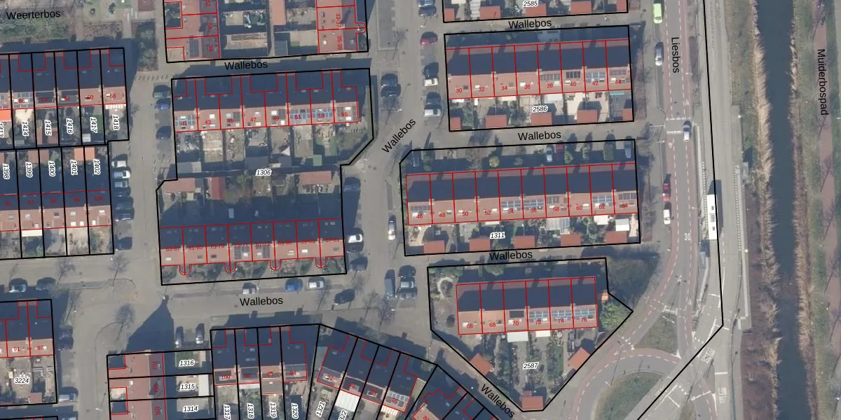 Het perceel waarop Wallebos 46 staat heeft een oppervlakte van 1370 m². Dit is een zeer groot perceel. De perceeloppervlakte wordt geregistreerd door het Kadaster. Gedetailleerde informatie over de maten van dit perceel kunt u vinden in het rapport Kadastrale kaart met maatvoering van Wallebos 46.