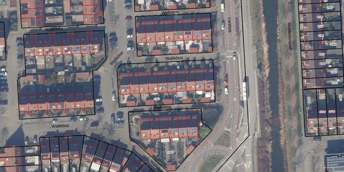 Het perceel waarop Wallebos 56 staat heeft een oppervlakte van 1370 m². Dit is een zeer groot perceel. De perceeloppervlakte wordt geregistreerd door het Kadaster. Gedetailleerde informatie over de maten van dit perceel kunt u vinden in het rapport Kadastrale kaart met maatvoering van Wallebos 56.