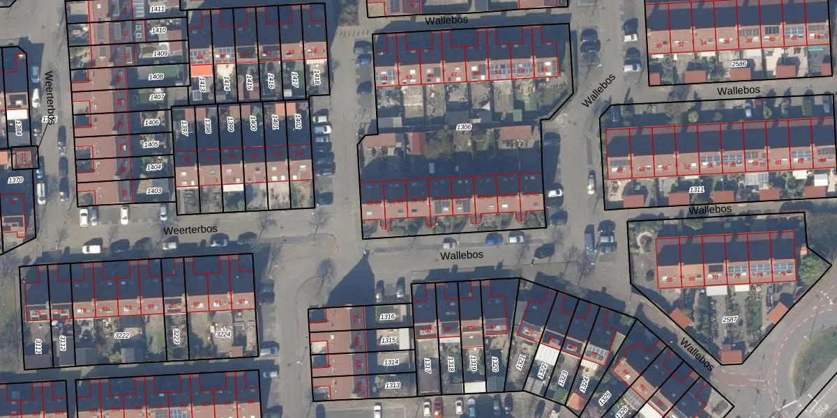 Het perceel waarop Wallebos 75 staat heeft een oppervlakte van 2166 m². Dit is een zeer groot perceel. De perceeloppervlakte wordt geregistreerd door het Kadaster. Gedetailleerde informatie over de maten van dit perceel kunt u vinden in het rapport Kadastrale kaart met maatvoering van Wallebos 75.