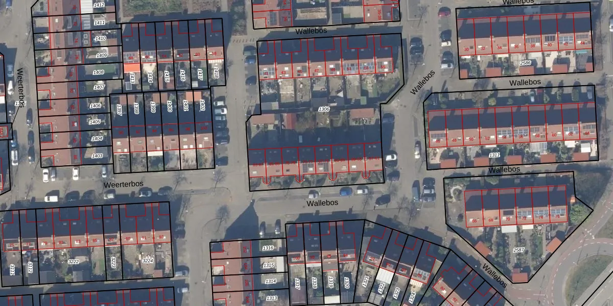 Het perceel waarop Wallebos 77 staat heeft een oppervlakte van 2166 m². Dit is een zeer groot perceel. De perceeloppervlakte wordt geregistreerd door het Kadaster. Gedetailleerde informatie over de maten van dit perceel kunt u vinden in het rapport Kadastrale kaart met maatvoering van Wallebos 77.