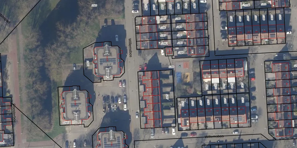 Het perceel waarop Willemsbos 100 staat heeft een oppervlakte van 900 m². Dit is een groot perceel. De perceeloppervlakte wordt geregistreerd door het Kadaster. Gedetailleerde informatie over de maten van dit perceel kunt u vinden in het rapport Kadastrale kaart met maatvoering van Willemsbos 100.