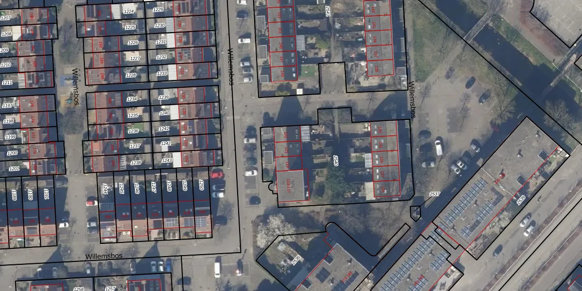 Willemsbos 121 is gelegen op kadastraal perceel HLM03P2540. Deze kadastrale aanduiding is uniek en wordt gebruikt door het Kadaster om eigendomsrechten en andere zakelijke rechten vast te leggen. Het perceel maakt onderdeel uit van de kadastrale gemeente Haarlemmermeer.