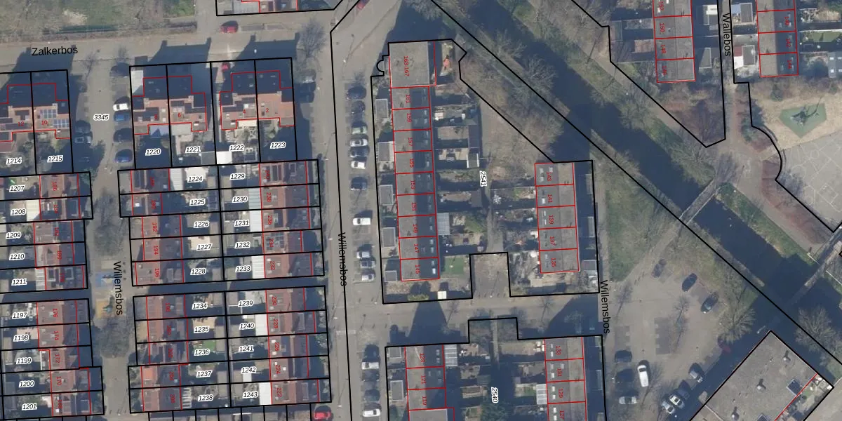 Het perceel waarop Willemsbos 151 staat heeft een oppervlakte van 2345 m². Dit is een zeer groot perceel. De perceeloppervlakte wordt geregistreerd door het Kadaster. Gedetailleerde informatie over de maten van dit perceel kunt u vinden in het rapport Kadastrale kaart met maatvoering van Willemsbos 151.