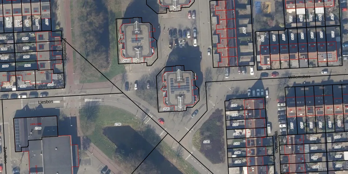 Het perceel waarop Willemsbos 28 staat heeft een oppervlakte van 550 m². Dit is een groot perceel. De perceeloppervlakte wordt geregistreerd door het Kadaster. Gedetailleerde informatie over de maten van dit perceel kunt u vinden in het rapport Kadastrale kaart met maatvoering van Willemsbos 28.