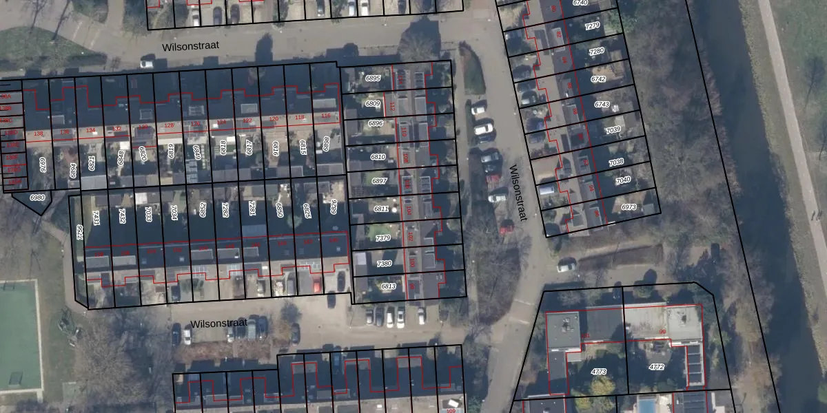 Het perceel waarop Wilsonstraat 104 staat heeft een oppervlakte van 171 m². Dit is een middelgroot perceel. De perceeloppervlakte wordt geregistreerd door het Kadaster. Gedetailleerde informatie over de maten van dit perceel kunt u vinden in het rapport Kadastrale kaart met maatvoering van Wilsonstraat 104.