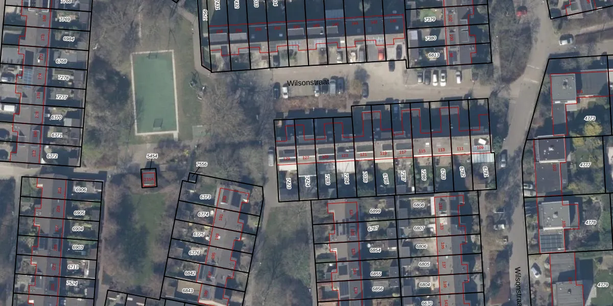 Het perceel waarop Wilsonstraat 127 staat heeft een oppervlakte van 173 m². Dit is een middelgroot perceel. De perceeloppervlakte wordt geregistreerd door het Kadaster. Gedetailleerde informatie over de maten van dit perceel kunt u vinden in het rapport Kadastrale kaart met maatvoering van Wilsonstraat 127.