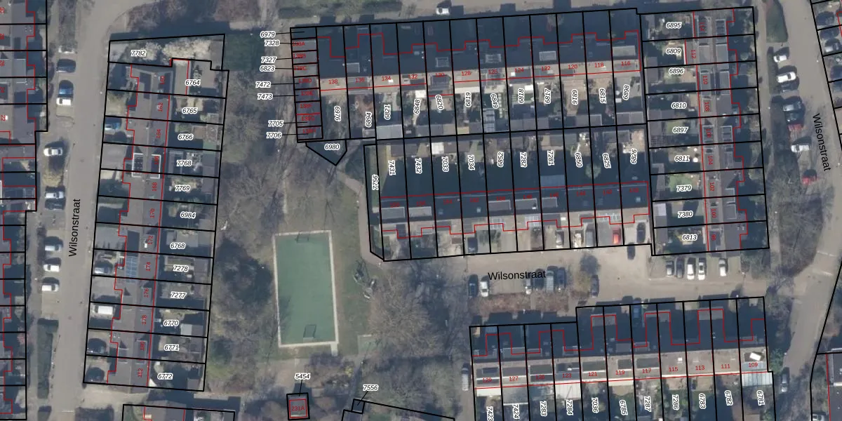 Het perceel waarop Wilsonstraat 156 staat heeft een oppervlakte van 181 m². Dit is een middelgroot perceel. De perceeloppervlakte wordt geregistreerd door het Kadaster. Gedetailleerde informatie over de maten van dit perceel kunt u vinden in het rapport Kadastrale kaart met maatvoering van Wilsonstraat 156.