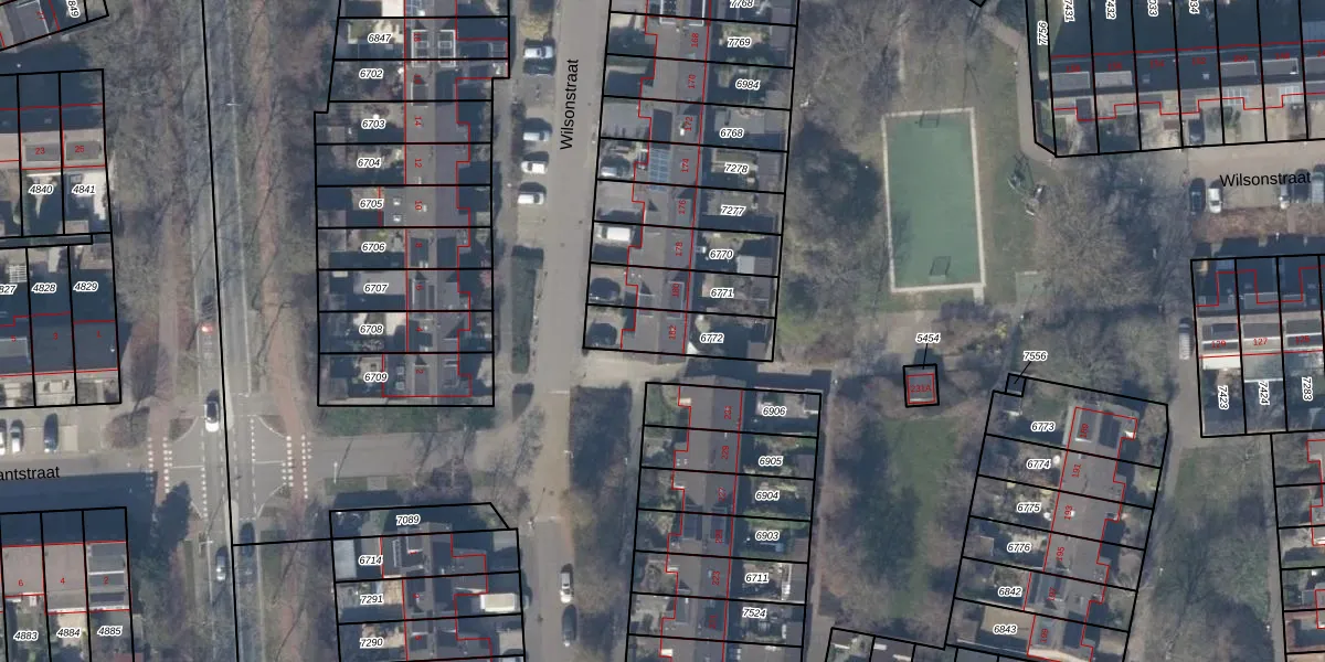 Het perceel waarop Wilsonstraat 182 staat heeft een oppervlakte van 187 m². Dit is een middelgroot perceel. De perceeloppervlakte wordt geregistreerd door het Kadaster. Gedetailleerde informatie over de maten van dit perceel kunt u vinden in het rapport Kadastrale kaart met maatvoering van Wilsonstraat 182.