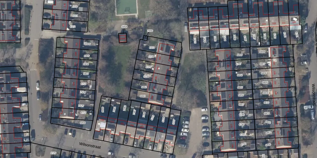 Het perceel waarop Wilsonstraat 195 staat heeft een oppervlakte van 169 m². Dit is een middelgroot perceel. De perceeloppervlakte wordt geregistreerd door het Kadaster. Gedetailleerde informatie over de maten van dit perceel kunt u vinden in het rapport Kadastrale kaart met maatvoering van Wilsonstraat 195.