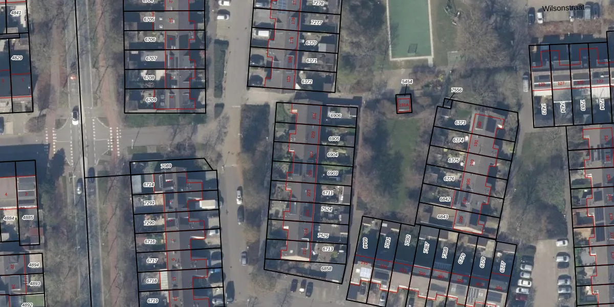 Het perceel waarop Wilsonstraat 227 staat heeft een oppervlakte van 166 m². Dit is een middelgroot perceel. De perceeloppervlakte wordt geregistreerd door het Kadaster. Gedetailleerde informatie over de maten van dit perceel kunt u vinden in het rapport Kadastrale kaart met maatvoering van Wilsonstraat 227.