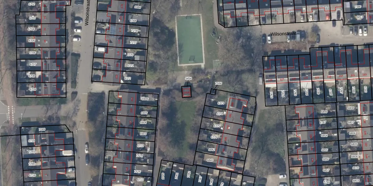 Het perceel waarop Wilsonstraat 231-A staat heeft een oppervlakte van 30 m². Dit is een klein perceel. De perceeloppervlakte wordt geregistreerd door het Kadaster. Gedetailleerde informatie over de maten van dit perceel kunt u vinden in het rapport Kadastrale kaart met maatvoering van Wilsonstraat 231-A.